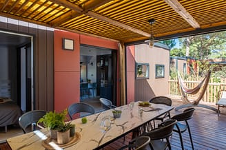 Das DALI ist eine Kombination aus zwei Cottages : 1 Cottage für 6 Erwachsenen und 2 Kindern + 1 Cottage für 2 Pers, die durch eine große Terrasse von über 50 m2 verbunden sind.