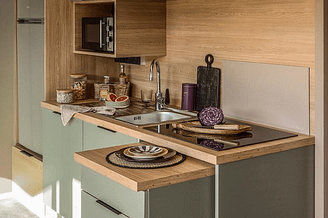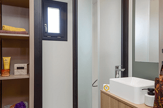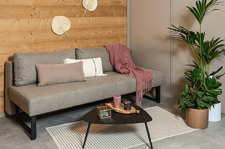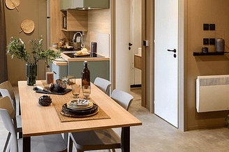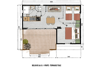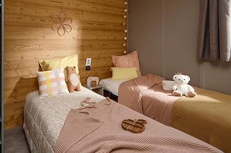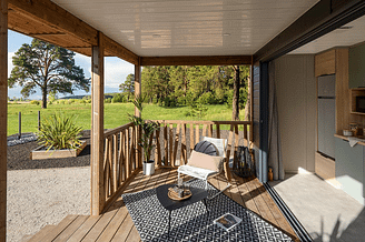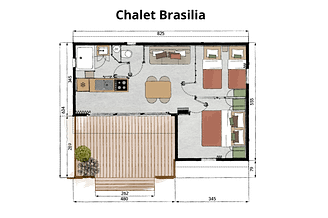 Ontdek onze 11 houten chalets, voor maximaal 4 personen, nieuw in het gebied Brasilia Village. De ruime woonkamer komt uit op een groot overdekt terras om van de tuin te genieten.